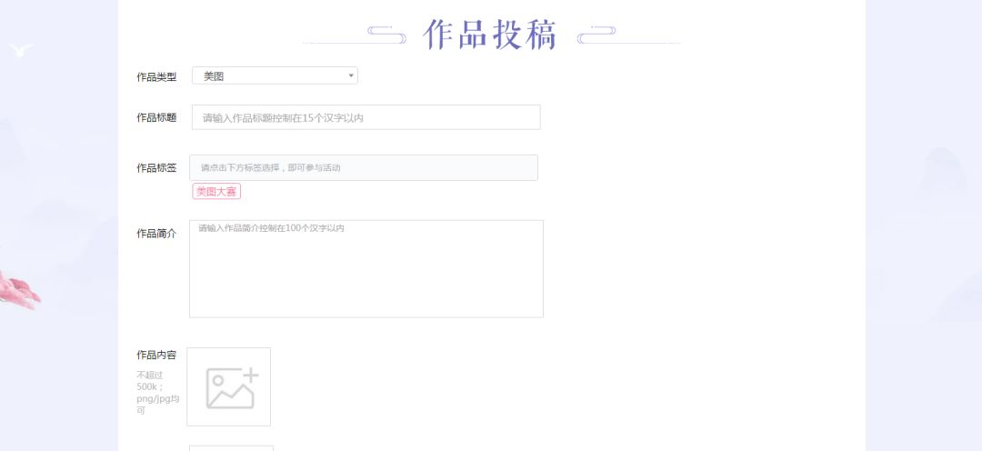 ② 大人进入投稿页面后,填写作品标题、简介;选择作品标签“美图大赛”;并上传游戏内的截图及封面。点击“内容预览”可查看预览效果,确认无误后点击“提交审核”,完成投稿;
