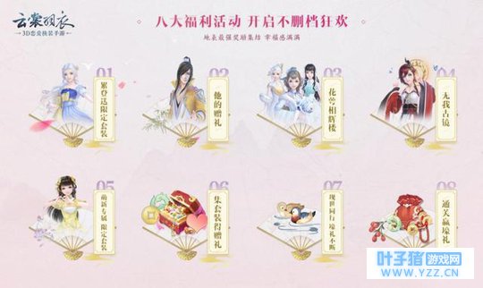 超值福利相送 为你的华裳之旅锦上添花 为了让各位玩家有更好的游戏体验,《云裳羽衣》特地在不删档上线之际为玩家们提供了一大波福利。每天会有固定时间可免费领取体力,累计登录可以获得专属套装,通关指定关卡及收集套装还可获得额外赠礼。在活动进行期间,玩家与任意命运之子的好感度达到指定等级,还能获得由命运之子亲手准备的,充满爱意的礼物哦!