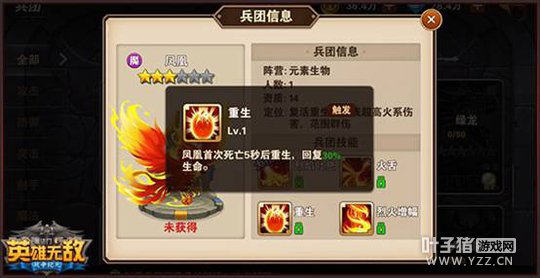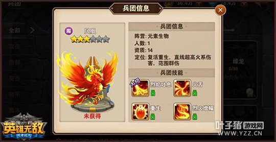 涅槃重生火凤凰超高范围火系伤害 元素城的七级兵凤凰,也是《英雄无敌3》中相当强力的终极兵种,2格的吐息攻击范围让其在进攻时事半功倍。《魔法门之英雄无敌:战争纪元》延续了凤凰范围攻击的这一特点,手游中凤凰的大招【烈焰吐息】能够对正前方的超大范围敌人造成巨额的AOE伤害,同时对处于灼烧状态的敌人附加暴击效果。凤凰的2技能【火舌】和4技能【烈火增幅】,都属于提升输出的BUFF技能,能够增加普通攻击伤害以及技能的暴伤。而凤凰的另一个神技是它的3技能【重生】,凤凰在战斗中首次死亡后会变为凤凰蛋,5秒后重生并回复30%生命。值得一提的是,凤凰蛋并不会受到敌人的攻击,而由于凤凰1单位兵团的属性,复活后的它可以保持100%的输出能力!对于新手玩家来说,凤凰可以通过首充6元获得,实在是一个不得不重点培养的强力兵团!