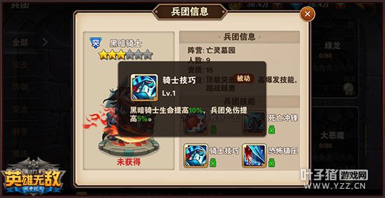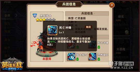 超级爆发黑暗骑士死亡冲锋势不可挡 相信喜欢墓园阵营的《英雄无敌3》老玩家,都不会忘记黑暗骑士这个最强六级兵之一,墓园由于7级兵鬼龙相对较弱,黑暗骑士可以说担当起整个团队输出的重任。小编也回想起几十个黑暗骑士在“圣灵佑佐”、“幸运之神”等魔法的加持下,秒天秒地秒空气的壮观场景。在手游中,黑暗骑士是一个突击兵团,依旧担当着强攻手的重任,具有极高的爆发伤害。黑暗骑士的大招【致命一击】,不仅能够对当前攻击兵团造成巨额伤害,还能够附加10秒的士气低落效果,可以说变相增加了自己的生存能力。而2技能【死亡冲锋】,则让黑暗骑士在突破了对手前排之后战斗力持续飙升,每击杀一个敌方兵团则可以提升10%的攻击,在加上黑暗其实本身对魔法和射手兵团就有一定的伤害加成,切起后排来如割草一般。黑暗骑士的3技能【骑士技巧】,为其增加了一定的防御能力,4技能【恐怖镇压】则是全面提高暴击暴伤,进一步强化输出。游戏中,黑暗骑士就像一把锐利的尖刀,能够快速撕开敌人的防守,直插后排大肆杀戮!
