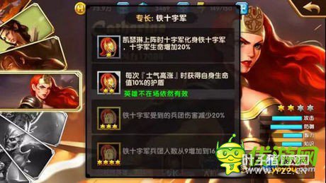 专长解析 凯瑟琳的专长为铁十字军,即凯瑟琳和十字军同时上阵时,十字军化身为铁十字军,生命增加15%。随着英雄星级的提升,铁十字军也会获得更多的增益效果,变得越来越肉。 阵容推荐 帝国弩手+僧侣+皇家十字军