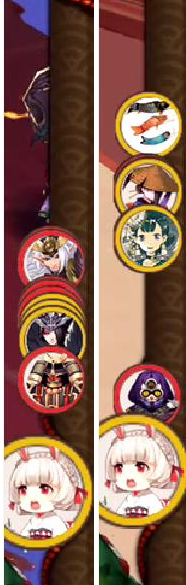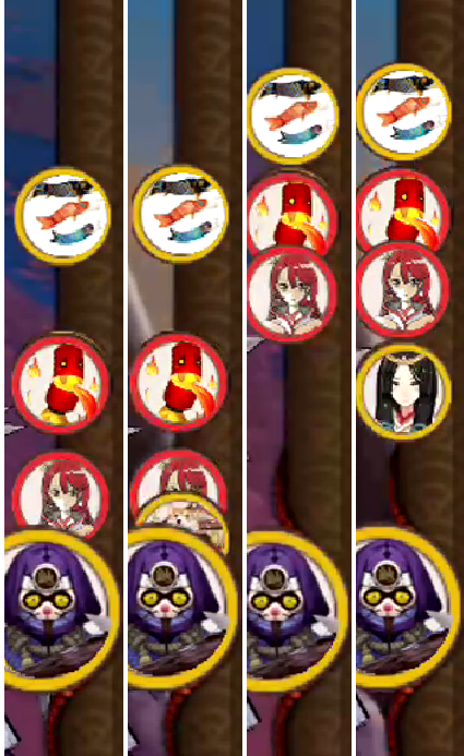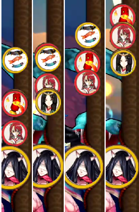 上图对比,每场pvp也好pve也好,战斗开场时,右侧那一栏引起了我的注意,意外发现每次的排序都是不同。 由此发现游戏中所指的行动条或许是右侧那幅卷轴,这就是游戏开场时,按照每个式神的速度所排序的行动出手顺序。 之后接着和好友实测,为了便于测试效果。采用228兔子,224镰鼬,100速度的狗粮式神和99速度的未觉醒犬神,我们来看下行动条对比图。 和惠比寿旗杆logo一致的那个其实并不是起点,后面会有说明。 行动条开场,兔子的位置处于镰鼬之前,晴明和神乐基本重合,灯笼和狗神基本重合。 兔子30%先拉动之后,我们发现神乐和灯笼30%行动条挪动后间距变大,镰鼬再拉30%后,神乐和晴明原本128的速度共同增加30%,原先同样的起点,同样的30%行动条却导致了不同的位置,包括原始的旗杆位置也进行了小部分挪动。 之后我再去趟御魂10层进行观察: 一回合速度排序 二回合速度排序 发现了问题了么,一速的位置固定是那一个点,为初始出手位。 随着一速的速度改变,左图168兔子,右图228兔子,其他式神速度不变。 式神的速度并没有多大的改变,变化的是行动条的长度。 并且由于副本怪的速度在140-160之间的原因 我方式神的整体速度排序上没有副本怪靠前,随着拉条的速度增加,行动条的距离拖长,低速式神即使被增加30%行动条,在位置排序上依旧赶不上副本怪的速度。 之后继续进行实测,我们欢迎本游戏的唯一一只清空行动条的式神—赤舌闪亮登场 赤蛇的能力是清空式神全部行动条,因此我们找到了这个点,0行动条也就是被清空的灯笼鬼所在位置,称为起点位置。并且值得注意的是赤舌之所以能够击退是因为开场所有的式神都已经具有了行动条。我们发现鲤鱼旗旗杆并不是起点。 继续,我们严谨的分析下不同速度的一速拉动和击退的行动条 食发鬼登场 上4张图依次顺序140速度食发鬼行动前,140速度食发鬼30%行动条击退后;224速度食发鬼行动前,224速度食发鬼30%行动条击退后。 发现了什么?其他变量不变,变了一速,导致两场式神的位次排列不同,一速改变了行动位次,并且可以说是速度越快行动距离被拉长了;然后我们还发现了什么?这个很震撼两次不同速度的击退对手式神,击退的距离居然是一模一样!!!击退的间隔距离一模一样!!!虽然一速不同导致的排序不同,但是两次击退行动条的间距却是一模一样。 而食发鬼的击退最为奇怪的地方就是,击退后我方式神位次和对手式神位次都会挪动。暂时先不去细分析击退的情况。 好了继续,这次轮到我们镰鼬上场 上4张图依次顺序137速度镰鼬行动前,137速度镰鼬30%行动条拉动后;223速度镰鼬行动前,223速度镰鼬30%行动条拉动后。 仔细看图,观察那只犬神未觉醒速度99几乎可以考虑和灯笼重合,前者拉动距离和后者拉动距离也是相同的。(虽然223速的拉动被八百遮住了)。 我们观察鲤鱼旗作为起点和镰鼬图标作为终点,分析下30%行动条的距离,3图和4图做对比,八百比丘尼被拉动的30%行动条,很明显不是整体的30%, 经过仔细的观察发现,式神被拉动的30%行动条是一速和被拉式神间隔距离的30%!!! 总结: ①pvp和pve开始后右侧的画卷为行动条,起点位置固定,一速的速度会改变长度; ②行动条的排列每场比赛都是单独的存在,并不是固定的; ③影响行动条排序的因素,双方式神的速度,因此差不多可以说几乎看不到相同的行动条排序; ④行动条的拉动是在排序的基础上,结合自己友方式神的次序进行拉动; ⑤关于刷御魂,由于副本怪的速度是固定的,因此我们可以总结出一速和副本怪速度之间大致的关系而避免被插队; ⑥即使pvp和pve开始的行动条长度是固定的,但是随着拉条、击退、加速buff的介入,每个回合的行动条长度和次序都不一样; ⑦为什么会被插队,则是行动条排列的位次,导致30%的拉动无法超越初始次序; ⑧30%的行动条计算:是开场时一速的排序和其他式神次序排序间距的30%(例如二速和一速间隔距离30,行动条增加量向前挪动9,然后爬到那个位置)。为何双拉条能稳定拉全队呢?一速拉条拉动二速拉条之间间距30%,二速拉条再拉动后续队友30%(已被一速拉动30%的队友后的位置)。以上就是目前通过测试得出的行动条情况,同时欢迎大家积极探讨。 [编辑:Hi、何同學]