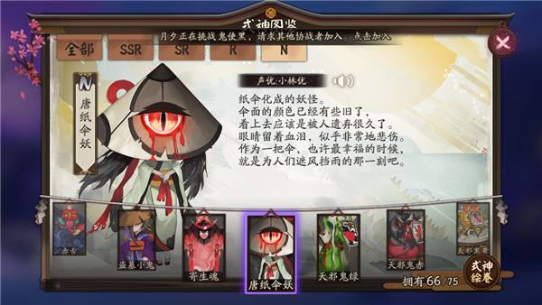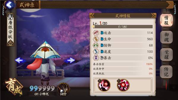 式神名称:唐纸伞妖(伞妖) 式神声优:小林优 式神故事: 式神情报: 式神点评:唐纸伞妖,N级式神卡,容易获取,属性中庸,无法觉醒, 2技能是2点鬼火消耗的AOE技能。属于第二梯队狗粮式神卡。式神技能介绍: 式神技能点评 1技能,普通攻击,无特点。 2技能,该技能属于低费AOE技能(消耗2点火),满级技能可造成攻击力130%的伤害,这个数值已经超越了作为R级式神卡——河童,大河之歌第一回合的伤害(河童的伤害是随回合的增加而增加),而且在鬼火消耗上还少1点。但纸伞妖由于局限于其作为N卡无法觉醒和基础属性中庸的原因,故上场率很低。式神搭配及用途 目前AOE中,第一类是多段依靠针女御魂打伤害或依靠控制御魂控制,第二类是类似于河童,梯度提高输出伤害。 通过对唐纸伞妖技能技能的分析,可以看出,此N级别式神卡属于只能坚挺第一回合的式神卡,虽然有满技能130%的攻击力的伤害,但局限于其作为N卡无法觉醒和基础属性中庸的原因,很少有玩家会将其作为主要式神进行培养,故唐纸伞妖在PVP和PVE中的出场率并不理想。 属于第二梯队的狗粮式神卡。式神御魂推荐搭配 通过对式神技能的点评和搭配及用途的分析,唐纸伞妖独立于游戏两类AOE式神,属于单段无增长AOE式神,在PVP和PVE中的出场率并不理想。 故暂无任何御魂推荐搭配。式神获取途径: 百鬼夜行契约书碎片合成,破碎的符咒召唤 了解更多相关信息,请前往http://sy.yzz.cn/yys/ [编辑:Hi、何同學]