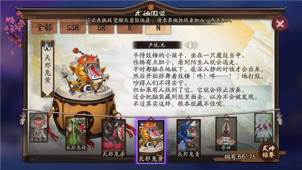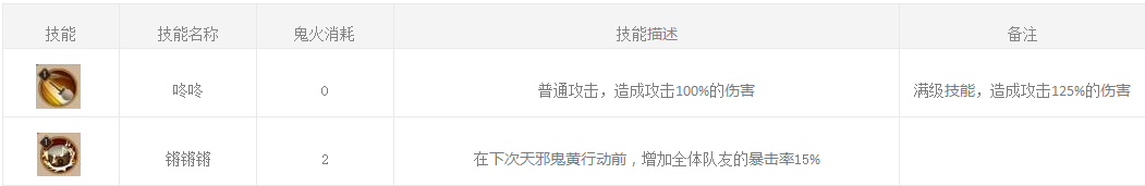 式神名称:天邪鬼黄(鼓) 式神声优:无 式神故事: 式神情报: 式神点评:天邪鬼黄,N级式神卡,容易获取,属性中庸,无法觉醒,2技能作为辅助技能配合特殊式神有不错的效果。式神技能介绍: 式神技能点评 1技能,普通攻击,无特点。 2技能,2点鬼火消耗,全体增益技能,增加全体队友的暴击率15%,这个相当于御魂2件套套装属性的增益量,然而技能描述中:在下次天邪鬼黄行动前,则让这个技能大大贬值,就是说只有1回合的持续时间。故天邪鬼黄的实用性和上场率并不算高。 (特别说明:阴阳师在有暴击率BUFF的情况下,也是可以出现暴击的)式神搭配及用途 天邪鬼黄在PVP与PVE中效果和用途基本相同,随着游戏的发展,相当多的玩家在6号位御魂上开始追求暴击伤害,而仅通过套装属性和副属性完成暴击率的堆叠。平民和非洲人想依靠这两部分使暴击率达到一个很高的状态,并不是一件容易的事,在这个时候,牺牲一个式神位,以天邪鬼黄代替,让己方C位式神在保证暴击伤害的情况下,暴击率能够达到100%。但毕竟是牺牲了一个式神位,所以,这个问题属于仁者见仁。笔者在此不好给出一个标准。适合搭配式神: 荒川之主(自身20%暴击+30%套装属性+15%天邪鬼黄,副属性35%) 针女拥戴者:姑获鸟、大天狗(迫切需要满暴击,以触发更多次数的针女)式神御魂推荐搭配 天邪鬼黄,在保证自身速度快于己方输出式神的情况下,御魂主要为辅助、肉盾类。 4招财猫+速度散件,由于自身技能需要2火,在有招财猫的情况下,百分比回火,使自己在真正需要鬼火的时候尽量避免断火的尴尬情况发生。 4蚌精+速度散件,蚌精主要作用于开场,开场提供等于生命值10%的护盾,但蚌精的护盾并不免疫控制效果,仅仅可以让后手阵容抵御一波伤害。 4镜姬+2件套生命,过去,现在,将来N级式神卡因为自身初始属性的中庸,不能觉醒的特点就是被对面集火的对象,所以使用镜姬这种御魂并不会有什么问题。式神获取途径: 百鬼夜行契约书碎片合成,破碎的符咒召唤 了解更多相关信息,请前往http://sy.yzz.cn/yys/ [编辑:Hi、何同學]