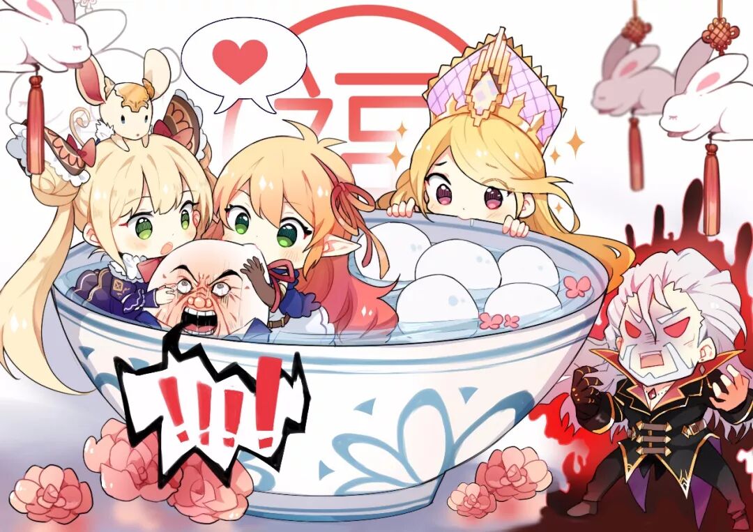 在这只又大又圆的碗里边, 汤圆们惬意地泡澡。 亚里莎和露娜泡在汤圆里边, 抱着一颗汤圆啃得津津有味。 伊莉丝趴在碗边上垂涎三尺, 已经跃跃欲试要跳下去啦~