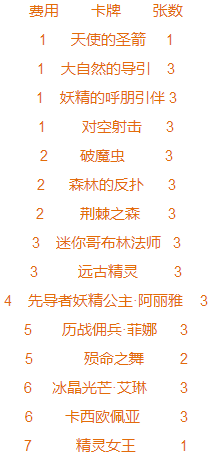 【魔法精灵公主】 进化时可以在手牌中加入两张0费的精灵,从而更容易达到OTK的目的。可以作为先导者妖精公主·阿丽雅的替补。