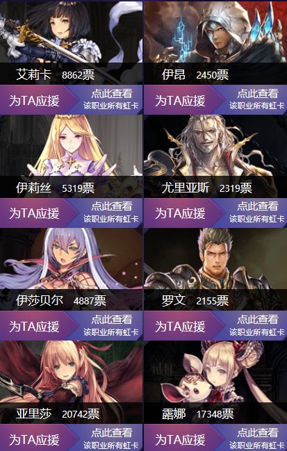▼▼▼ 第二场对决的角色是 伊莉丝 尤里亚斯 各位主战者注意啦! 对决期间 两个角色应援 票数翻倍 哦!