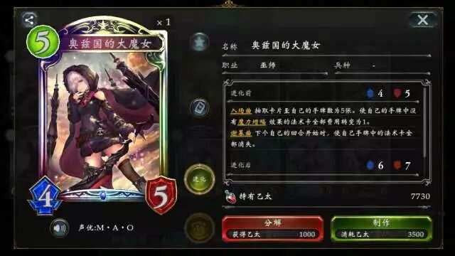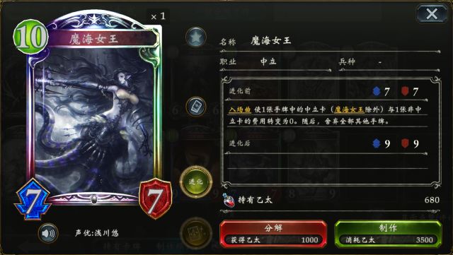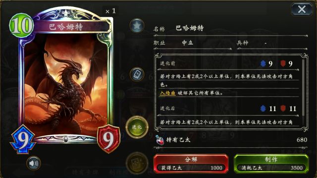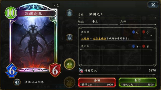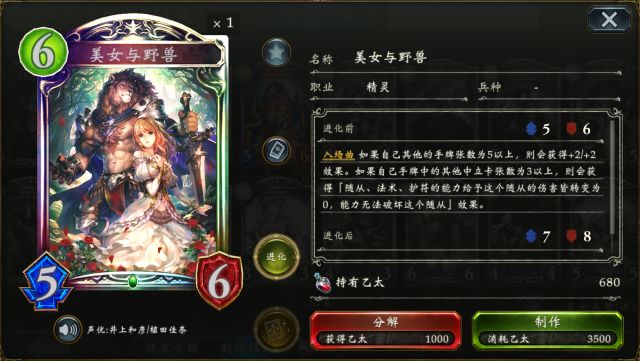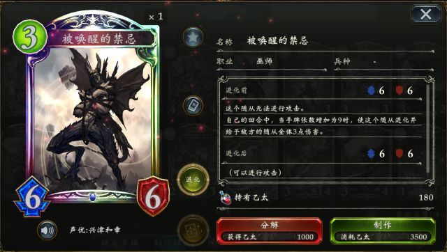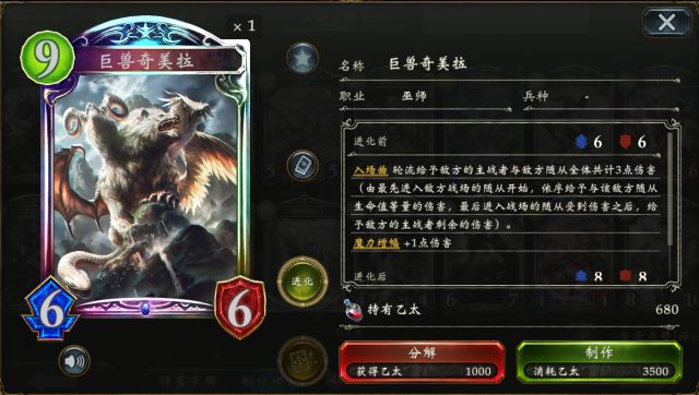 奥兹国的大魔女 可使得自身手牌增至5张并让手中的法术卡费用都变为1,既能解决后期手牌短缺的问题,亦能让各种法术卡灵活搭配,唯一需要注意的是,此随从被解后,手中的所有法术卡都会消失,切勿随意入场~ 被唤醒的禁忌 巨兽奇美拉 (点击卡牌头像即可查看卡牌详情) 被唤醒的禁忌 作为3费却有6/6的面板,配合各种过牌还能触发“对方全场受到3点伤害”的特效,不仅能化解敌方强力的铺场,也能选择消耗进化点直接打脸~