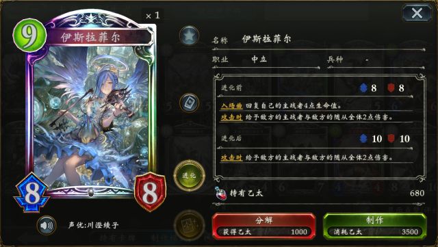路西法 进化前每回合可奶4点血,而进化后则可每回合扣除对面4点血,加上自身不错的面板与gay爆的卡面,都给我留! 伊斯拉菲尔 巴哈姆特 (点击卡牌头像即可查看卡牌详情) 伊斯拉菲尔 入场后即可为主战者提供4点生命回复,并且自身攻击时会优先触发【对方全体受到2点伤害】的攻击特效,有着不错的返场能力的同时还能减轻血量压力prprpr~