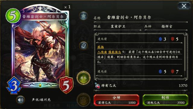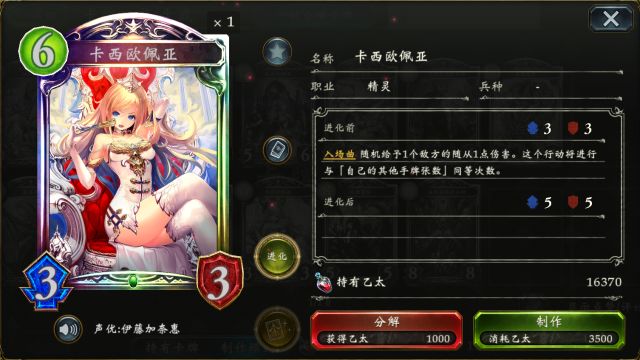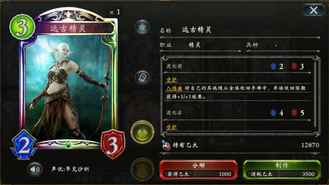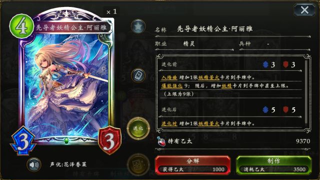 深渊之王 会将主战者的卡组变为一副仅有10张固定卡牌的“启示录牌组”,牌组内充斥着直伤,疾走与面板奇高的随从。而在拉锯战中也可起到卡组续牌的效果,避免了因手牌抽空而失败的情况~ 精灵虹卡 先导者妖精公主·阿丽雅 远古精灵 (点击卡牌头像即可查看卡牌详情) 先导者妖精公主·阿丽雅 配合进化点能获得俩张“妖精萤火”(0费,在使用2张卡以后,此卡入场直接消失), 可使得 破魔虫 (根据本回合使用的卡牌数获得+1/+0,疾走)获得更高的斩杀血线,是完成otk的关键卡牌。