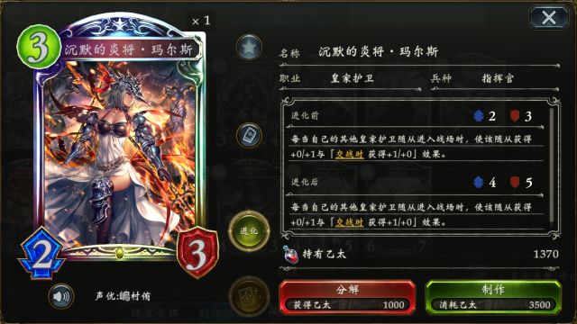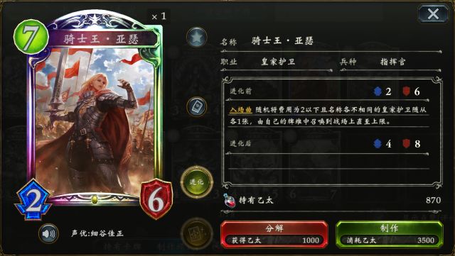 昆虫王 会根据已使用的卡牌数随机使得对方一只随从获得相应的伤害,无论在前期抢场面或是清理高费随从都有着不错的效果。 美女与野兽 (点击卡牌头像即可查看卡牌详情) 美女与野兽 配合手牌里中立卡牌的数量能获得一层免除能力伤害的护盾,配合自身强力的面板经常能让对方无法击破,从而做到极具威胁性的站场。 “野兽前辈”可谓是必留虹卡了~ 皇家虹卡 骑士王·亚瑟 沉默的炎将·玛尔斯 (点击卡牌头像即可查看卡牌详情) 骑士王·亚瑟 在7费能完成一波满场的铺场,给予对方较强的场面压力。