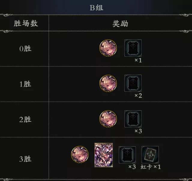 [决战回合(B组)] 0胜:头像、随机卡包券1张 1胜:头像、随机卡包券2张 2胜:头像、随机卡包券3张 3胜:头像、随机卡包券3张、虹卡1张(随机) 决战回合(B组)奖励 包括限定头像、卡背【血色女王·斑比】