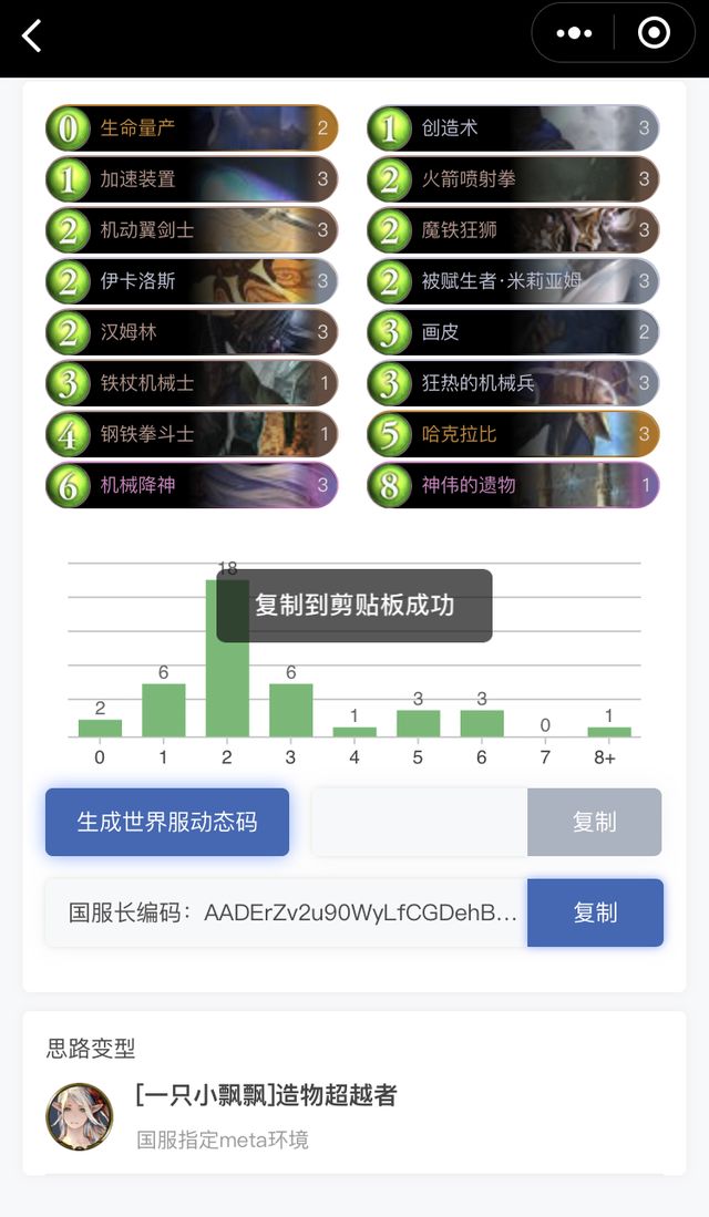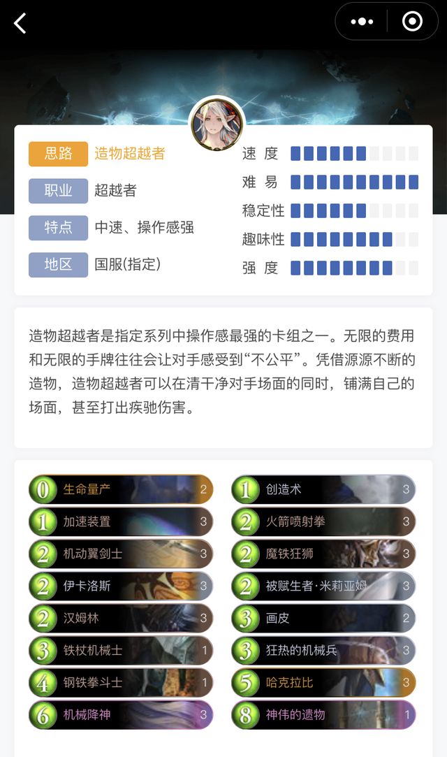 用户可以根据费用、职业、稀有度、类别 以及卡包系列名称来进行检索分类 当然,如果你嫌一个个点击太麻烦 直接在上方输入卡牌的部分 名称 也是可以直接检索到想找的单卡的 套牌广场则是给大家直接 抄卡组 的地方~ 流行思路表示环境中最强势的卡组 不知道大赛用什么的话直接抄这里就好噢! 职业套牌 则可以根据职业进行分类 进入后可以根据标签进一步筛选 套牌专题 则是不同的套牌汇总 在里面可以找到各式各样你喜欢的套牌哈~ 点击进入任意一套牌后 可以看到这套卡组的各种 参数信息 包括我们对各个属性的打分以及简评 往下拉可以看到整个卡组的构成 以及曲线指数 最下方可以直接生成 国服长编码 点击复制后就可以直接粘贴到游戏内一键抄卡组啦! 怎么样,是不是很方便? 新手指引部分有最贴近萌新的各类精品文章 文章的撰写都是从 萌新 的问题出发 职业介绍,开包指导,游戏“黑话” 抄卡组,分解指南,应有尽有! 点击任意一项进入后就可以查看里面的文章了