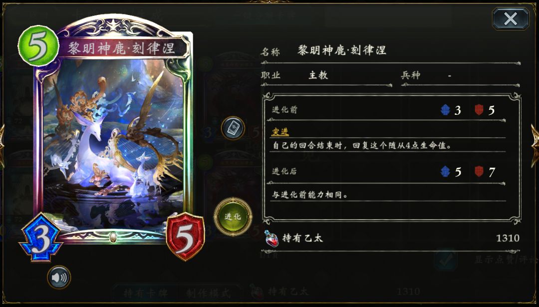 常用配合 << 滑动查看下一张卡牌图片 >> 【 吟唱:白牙神殿 】 + 【 天狐之社 】 每回合稳定触发一次神社的炮弹,保证神社与白牙神殿同时在场,就拥有了巨大的场面压制力。由谢幕曲诞生的6/6白龙,也拥有优秀的站场能力。 << 滑动查看下一张卡牌图片 >> 【天狐之社】 + 【黎明神鹿·刻律涅】 刻律涅的光明形态也与神社配合良好,它拥有突进与自我回复能力,可以稳定解1个4攻3血以下的随从并触发神社的随机打2。 【愚神礼赞】 + 【夜幕神鹿·刻律涅】 在面对不得不解的大随从时,刻律涅的黑暗形态可以配合愚神礼赞,也可以进化自身利用必杀解决问题。