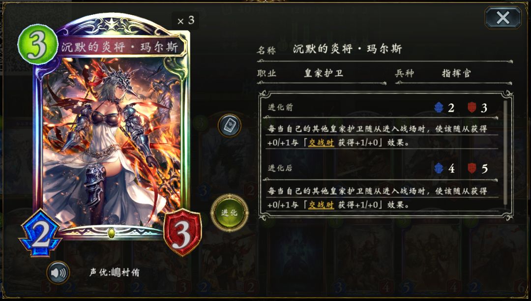 沉默的炎将·玛尔斯 则是皇家十分强力的3费曲线,一旦成功buff其他随从就可以扩大场面优势