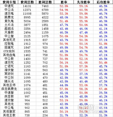 上均为全等级记录 总体统计数(159,108)比上周(178,531)减少19,423 中立法延续其惊艳的表现,综合56.3%、M段54.9%的高胜率(怕不是月末又得为魔将军挡刀了) 使用率也上升至第三(M段第二) 血鬼使用率下滑至第三位 其代表卡组速攻鬼,也从卡组使用率的第一位滑至第二位(M段滑至第三) 看看下水道方面: 本周下水道凑齐三人组(皇、教、妖) 皇家还能和上游职业不分上下,而地心少女的胜率则进一步下滑 下附M段