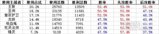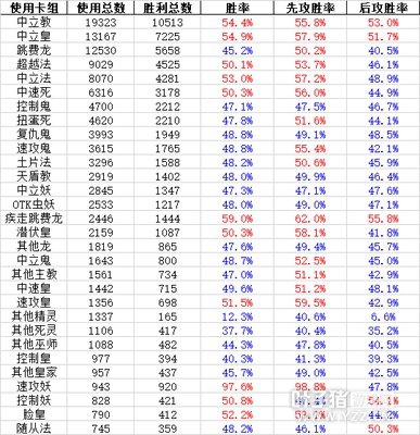 上均为全等级记录 因为宝箱活动,统计数比起上上周有大幅增长 总体统计数(205,885)比上周(200,280)增加5,605 本周胜率高于50%的都是中立所在的三大职业,其使用数也是在七职业中名列一二三 中立体系方面,除了中立法外胜率均有所上涨,中立法极小幅下降 中立教综合胜率55.3%,M段胜率54.4% 中立皇综合胜率55.5%,M段胜率54.9% 中立法综合胜率54.2%,M段胜率53% 那么女巫为什么使用率上升至第二呢? 答案是超越法,本周M段超越统计数为9,031已高于中立法统计数8,070(算上其他段位还是中立法更多一些) 环境中大量的跳费龙、控鬼、扭蛋死成为了超越法的猎物 超越法综合胜率48.8%,除去部分可疑数据(M段打跳费龙400场先手)超越法M段胜率约为47.8% 此外某个卡组的数据大家明眼人都看得出是不是刷的就不用说了 下附M段