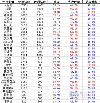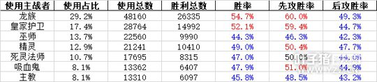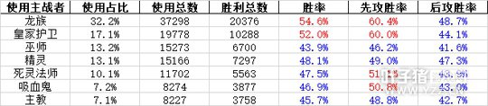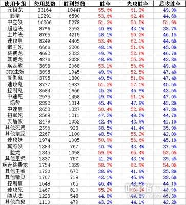 上均为全等级记录 总体统计数165,090 M段统计数115,718 总体统计数(165,090)比上周(203,848)减少38,758 M段统计数(115,718)比上周(144,578)减少28,860 下面是各职业情况简述 龙族凭借元祖龙稳定地发挥,依旧站立于所有职业的最顶端 还是只有速攻皇和疾走教能够克制元祖龙 跳费龙胜率稳定于50%上下 脸龙胜率很高,部分脸龙的战绩分到了元祖龙上,但不否认元祖节奏龙确实是现在很容易获胜的构筑 元祖龙综合胜率55.6%,M段胜率55.2% 跳费龙综合胜率49.7%,M段胜率50.1% 脸龙综合胜率59.5%,M段胜率59.8% 皇家排名第二 和上周基本一样就不多加赘述了 这里依旧列出克制速攻皇的卡组:中立妖(大优)、跳费龙(小优)、控制鬼(小优)、中速皇(大优)、奶教(小优)、脸龙(小优) 速攻皇综合胜率53.5%,M段胜率53%(脸皇和速攻皇合并) 中速皇综合胜率50.4%,M段胜率51.7% 控制皇综合胜率46.4%,M段胜率45.9% 巫师使用率排名仍然是第三,但M段超越法的胜率已经低于了40% 土片法胜率也不甚理想 巫师已经是胜率最低但玩家(抖M)数极多的矛盾职业了(不否认环境中依旧有优秀的超越构筑和优秀的超越玩家) 超越法综合胜率40.8%,M段胜率39.7% 土片法综合胜率48.1%,M段胜率47.6% 精灵稳定排名第四 中立妖玩家继上周之后继续增加,现在已经是仅次于元祖龙、速攻皇的第三卡组,胜率也保持在50%以上,已经算是半只脚迈入了T1的行列 此外的精灵构筑也有不错的发挥,虫妖、速攻妖的胜率均稳定在50%的水平 中立妖综合胜率51.2%,M段胜率50% OTK虫妖综合胜率49.9%,M段胜率48.2% 速攻妖综合胜率50.9%,M段胜率50.5% 死灵排名第五 骸王死和中速死相比上周胜率均有所上涨,但也是中规中矩 千金这张假卡有望在元祖龙削弱后带领中速死卷土重来,可以抱有一点期待 骸王死综合胜率48.1%,M段胜率48.1% 中速死综合胜率49%,M段胜率48.7% 扭蛋死综合胜率47.2%,M段胜率44.6% 血鬼的使用率相比上周有所增加,排名第六 速攻鬼的胜率是鬼职业中最高的,但相对的是,M段中使用率最高的是复仇鬼,其次是控制鬼,最后才轮到速攻鬼 只能理解为大概是速攻鬼玩家已经玩腻了那套从ROB打下来的套路了 复仇鬼综合胜率49.5%,M段胜率48.5% 速攻鬼综合胜率51.3%,M段胜率50.5% 控制鬼综合胜率45.2%,M段胜率43.4% 本周垫底的则是主教 本周主教玩家终于完成了转型,从主要使用天盾教转为使用疾走教 疾走教的胜率现已高于52%,确实值得主教玩家用于现在的天梯环境(还有一点在于,疾走教打元祖龙是优势对决) 而奶教和天盾教这种偏慢的构筑已经算是被这个版本的天梯环境所淘汰了,期待下周削卡后主教的控制体系能否重新找回自己的地位 疾走教综合胜率53.1%,M段胜率52.5% 奶教综合胜率45.4%,M段胜率45.7% 天盾教综合胜率42.4%,M段胜率40.8% 下附M段