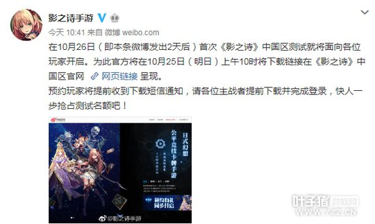 来自影之诗官方微博最新消息:10月25日上午10点将开启下载,预约的玩家会提前收到短信通知。 微博原文: 在10月26日(即本条微博发出2天后)首次《影之诗》中国区测试就将面向各位玩家开启。为此官方将在10月25日(明日)上午10时将下载链接在《影之诗》中国区官网呈现。 预约玩家将提前收到下载短信通知,请各位主战者提前下载并完成登录,快人一步抢占测试名额吧!
