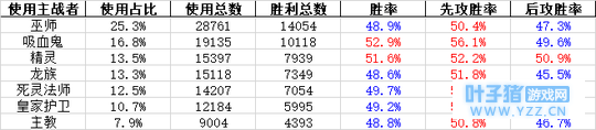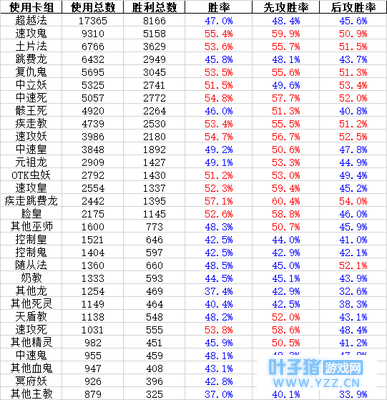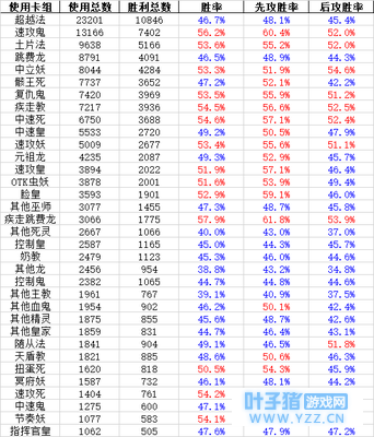 上均为全等级记录 总体统计数169,635 M段统计数113,806 总体统计数(169,635)比上周(138,094)增加31,541 M段统计数(113,806)比上周(90,550)增加23,256 下面是各职业情况简述 巫师因为速攻皇的削弱以及KT超构筑的诞生,在超越的带动下顺利成为使用率第一的职业 但因为超越对使用者要求相对较高,和过往的T1不一样,使用率最高(几乎是使用率第二位的速攻鬼的两倍)但是胜率并没有超过50%(对操作者要求极高的卡组在M段胜率已经高达47%) 在超越已经几乎能在面对中速是呈优势对决的环境下,大家也是在不断地提速,其中巫师的提速是土片法,土片本周胜率意外的高于50% 超越法综合胜率46.7%,M段胜率47% 土片法综合胜率53.6%,M段胜率53.6% 随后的则是自ROB环境以来拥有最泛用速攻的血鬼 速攻鬼在超越法占据环境主流的情况下,通过克制关系顺利上位 复仇鬼也拥有极强的爆发斩杀能力,在这个环境下也是能够大吃痛吃 速攻鬼综合胜率56.2%,M段胜率55.4% 复仇鬼综合胜率53.5%,M段胜率53.5% 控制鬼综合胜率44.7%,M段胜率42.5% 精灵排第三位 原本使用率排名第三的中立妖在两大毒瘤元祖龙和速攻皇削弱后,虽然没有顺利上位,但在这周内依旧保持着极高的使用率 此外,精灵通过使用速攻妖进行提速,也顺利地吃下当前环境中的大多数超越法 中立妖综合胜率53.3%,M段胜率51.5% 速攻妖综合胜率53.4%,M段胜率54.7% OTK虫妖综合胜率51.6%,M段胜率51.2% 死灵紧随其后,3-6位的差距并不是很大 骸王死依旧是死灵玩家的心头好,但本周整体表现并不理想 相对而言,中速死正如我上上周所说,成功地在千金的带领下通过吃环境中的速攻卡组卷土重来 骸王死综合胜率47.2%,M段胜率46% 中速死综合胜率54.6%,M段胜率54.8% 扭蛋死综合胜率50.5%,M段胜率49.9% 龙族在元祖龙削弱后只能重新依靠跳费龙体系,但很遗憾的是该体系是超越的猎物之一 相对之下,上个月留下来的元祖龙通过提速,依旧能有较好的发挥,可惜胜率也不足50% 跳费龙综合胜率46.5%,M段胜率45.8% 元祖龙综合胜率49.3%,M段胜率49.1% 脸龙综合胜率57.6%,M段胜率58.8%(可算入元祖龙内) 皇家在削弱后也并没有针对环境中的超越采用速攻,而更多人使用中速皇这种操作性更为强的构筑,但效果并没有大家想象中那么好 相对的,速攻皇依旧在胜率上保持一个较高的水平 中速皇综合胜率49.2%,M段胜率49.2% 速攻皇综合胜率52.4%,M段胜率52.5%(脸皇和速攻皇合并) 控制皇综合胜率45%,M段胜率42.5% 本周主教继续垫底 疾走教的使用率依旧保持为该职业最高,很明显也非常适用于现在这个环境 而奶教和天盾教这种偏慢的构筑依旧被环境所淘汰,大量超越的环境下,这种构筑估计也是很难混出好的成绩了 疾走教综合胜率54.5%,M段胜率53.4% 奶教综合胜率45.3%,M段胜率44.5% 天盾教综合胜率48.6%,M段胜率48.2% 下附M段