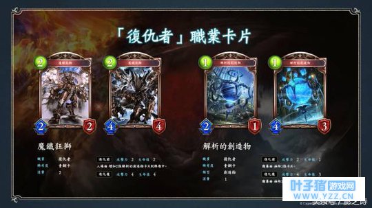 【魔铁狮】 2费-复仇者-铜-从者 2/2→4/4 入场曲: 将2张解析神器加入牌组。 【解析神器】 1费-复仇者-铜-衍生物 2/1→4/3 谢幕曲: 抽1张牌。 复仇者的主要战斗方式是以能将神器加入牌组的卡牌,配合能将神器从牌组中抽到手的卡牌。复仇者拥有很多能改变牌组数量的手段,以此来追求共鸣。