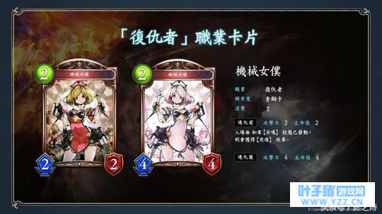 【机械女仆】 2费-复仇者-铜-从者 2/2→4/4 入场曲: 若已共鸣,获得突进。 复仇者的某些卡牌还拥有新类型「神器」,这些牌都非常强力,无法编辑进牌组,而是以衍生物的形式存在。