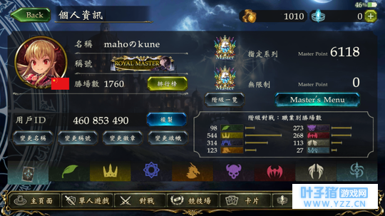 个人信息 右上角的个人信息,差不多是这样的,就不详细介绍了 看看就好 用户id就是系统给你的账号 不能忘的,最好做个备份 说不定哪天就忘了 下面从左到右分别是精灵 皇室 巫师 龙族 死灵 吸血鬼 主教 复仇者一共8个职业