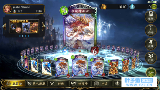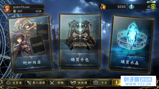主页面 主页面大概是这样的,左上角是【个人信息】,右上角【金币】【水晶】, 然后依次往下分别是【礼物】、【公告】【任务】【好友】至于那个【进化】按钮请看下图,下面从左到右分别是【主页面】【单人游戏】【对战】【竞技场】【卡片】【商店】以及其他