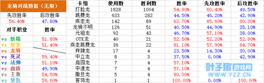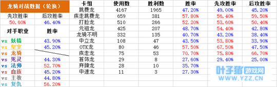龙骑 昔日的环境霸主龙骑,本周使用率已经被妖精所超越(15.7%→13.7%),同时胜率上也仅高于血族和鱼丸(49.1%→48.5%)。