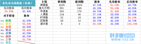 1.随着使用率和胜率的渐渐提高,神器鱼逐渐受到了更多玩家的青睐。在有了上周48.7%的胜率之后,越来越多的玩家开始愿意尝试鱼丸这个新职业了。本周神器鱼的使用率也随之提高(8.1%→9.8%),目前已经是轮换模式中使用率第二高卡组了。不过也许是有了太多不熟悉鱼丸这个职业的新人涌入的关系,神器鱼的胜率有了略微的下滑(48.7%→47.5%)。鱼丸这个职业操作复杂,需要考虑的也更多,在dalao和萌新的手里差别巨大,这是其胜率一直低迷的一大原因。不过随着越来越多的玩家加入到鱼丸的行列中去,这个新职业的将来也会变得更加明朗。