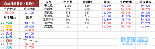 血族 血族依旧呆在下水道中(7.8%→7.1%),不过因为控鬼本周胜率暴涨13.2%的关系(存疑),血族的胜率得以超越鱼丸拜托垫底(46.7%→47.8%)
