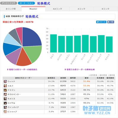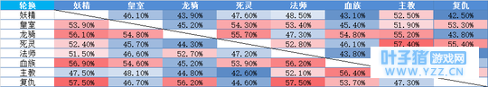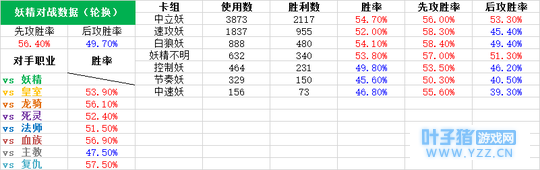 妖精 妖精本周的使用率(13.9%→12.2%)和胜率(52.8%→52.5%)都略微下滑,使用率被大幅上升的龙骑所超越。胜率则是被血族重新夺走了第一的位置,终结了