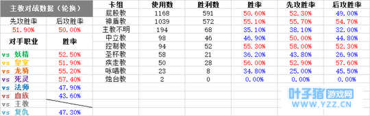 2.神盾教数据存疑 本周神盾教的胜率居然再次大幅上扬(51.4%→55.1%),超越了中立妖,在主流卡组中仅次于中立法。不过这个数字的可信度略显不足,比如之前还是大劣的随从法,本周突然变成了优势(51.2%)。加上考虑到神盾教的使用率过低(1.5%→2.2%),神盾教真实的胜率还要继续观察。