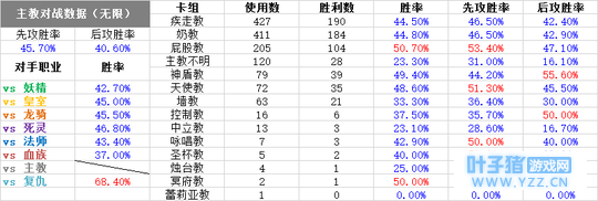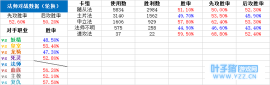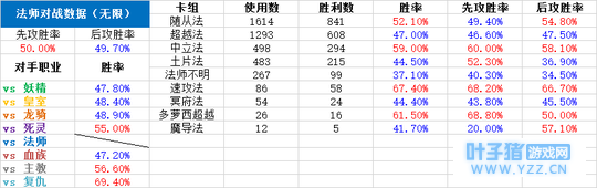 法师 无限环境的提速,让超越法的胜率大幅跳水。本周法师的胜率明显下滑(50.8%→49.8%),跌破了红线。同时使用率也明显缩水(22.1%→19.7%),被血族拉开了差距。