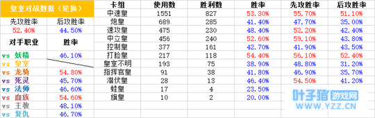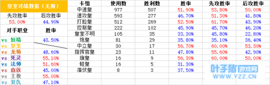 皇室 皇室的使用率(12.0%→11.7%)和胜率(49.4%→48.9%)都微微下滑,双双排在第五位。
