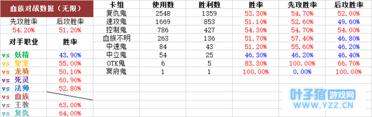 血族 在夺回使用率第一的3周之后,血族的胜率终于也重新回到了第一(51.6%→52.7%)。本周血族使用率明显上升(22.4%→24.5%),终于和法师拉开了差距,真正统治了无限模式的天梯。