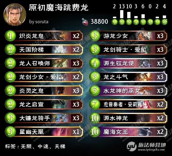 天国阶梯的过牌能力允许这套牌只使用少量的魔海体系组件,而这可以增加套牌稳定性。 这套牌的跳费能力充裕,不愁找不到机会使用天国阶梯。无论是增效使用还是正常使用都不错。 【优点】致胜手段难以防备,对慢速套牌优势。 相比普通跳费龙,这套牌的前中期能力更强,对偏快套牌胜算更大。 【缺点】难以应付大随从铺场,对节奏法劣势。 【留牌】留龙之启宣、龙剑骑士·爱拉、游龙少女。 后手留龙剑少女·爱拉。 后手对鬼留低费解牌。 先手有龙宣的话留龙之斗气。 今天的内容就是这些,大家有任何意见建议或想分享的思路都欢迎联系我。