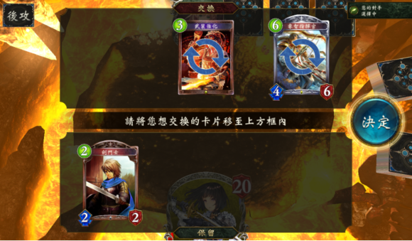 首先游戏会为玩家抽取3张卡牌,玩家可以选择其中任意数量卡牌退回卡组并重新抽取同等数量的卡牌。通常情况下为了开局能够立刻使用卡牌,会换走高消费的卡留下低消费的卡。
