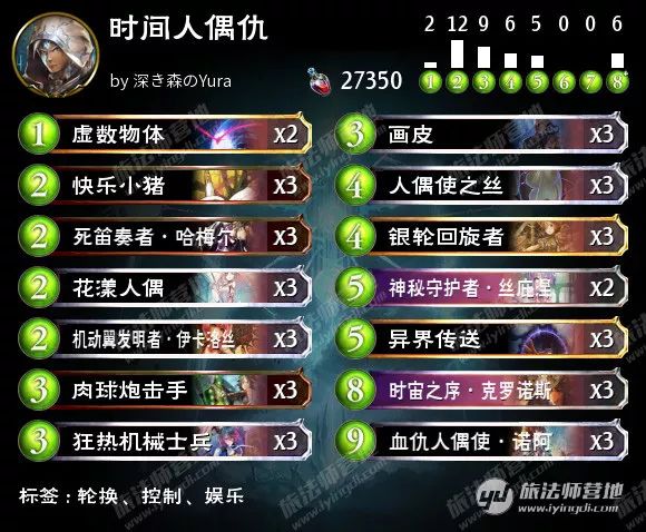 强度:2 优劣势对局明显,目前劣势对局较多。 速度:2 偏快的控制,一般在10~11回合取胜。 稳定度:3 依赖时间神的及时上手。有容易卡手的组件。 操控容易度:3 作为控制,需要对对手套牌有足够了解,以此分配好资源并制定好游戏计划。 有趣度:3 面对特定对局时能获得非常有趣的游戏体验。 作者:深き森のYura(推特:CALM_nemui_Zz)