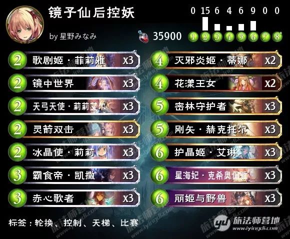 强度:4 优劣势对局与空天控妖接近,只是上限更低、下限更高。 速度:2 介于中速与控制之间。 稳定度:4 曲线低,费用利用率高。 操控容易度:2 回合数多,每回合的抉择多,同时容错率不高。简而言之,在大量的抉择中不允许犯错。 有趣度:3 游戏体验在控制套牌中比较独特。 作者:星野みなみ 战绩:作者使用这套牌取得JCG公开赛冠军(256人,BO3,另一套牌是中速死)。 我使用这套牌在GM段10战7胜。