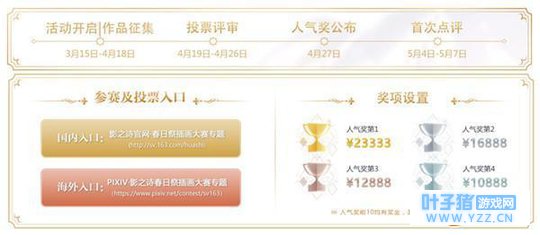 此次比赛共分为国内、国际两个赛场,国内赛场可向《影之诗》进行投稿参赛,国际赛场由著名绘画网站Pixiv作为平台面向全世界进行绘画征集。 各位参赛的主战者可以通过绘画作品来尽情展示自己的创作实力与游戏感悟,与国内外的绘画大触们一起探讨交流,一起PK画技,更有来自日本Cygames公司的原画师来进行专业点评。优秀的作品将有机会植入游戏,成为官方卡背,还有总价值高达240,000元人民币(折合超过4,000,000日元)的巨额胜者奖励在等着大家。 比赛现正火热进行中!来自国内外的众多画师们已经纷纷投稿参与,不要再等待,快拿起你的画笔加入吧。如果对自己的画功感到不自信也没关系,那就为你喜爱的作品与画师投上宝贵的一票吧。 神秘声优助阵 加持顶级大奖光环! 除了精美的画作,各位《影之诗》的主战者们也都知道,这个游戏的一大特色就是声优阵容够华丽,而本次大赛主办方也考虑了这一点,特邀担纲《影之诗》中某位人气角色配音的日本著名声优倾情献声,亲自宣布奖项获得者! 怎么样?想不想听到自己的名字从知名声优的口中念出?想不想聆听人气声优用磁性声线宣读的点评?想不想和顶级声优发生超越时间空间的隔空互动?那还等什么,快点来参加影之诗国际全平台绘画比赛吧! ※参赛规则及投稿方式 此次大赛以【春日祭】为主题,参赛的主战者们可以参考官方角色原画来为《影之诗》设计一张游戏卡背。 绘制内容不限,但画面要有背景,投稿后通过人气投票来选出最受欢迎的作品。 除了国内赛场之外,绘画网站Pixiv已于3月19日起,作为国际赛场面向全世界进行绘画征集。 各位主战者可以通过《影之诗》或者Pixiv网站来进行投稿。 更多详细赛事介绍及规则,请登录《影之诗》专区论坛查看。 目前我们已经收到不少参赛投稿了,为大家小小的展示一下吧~