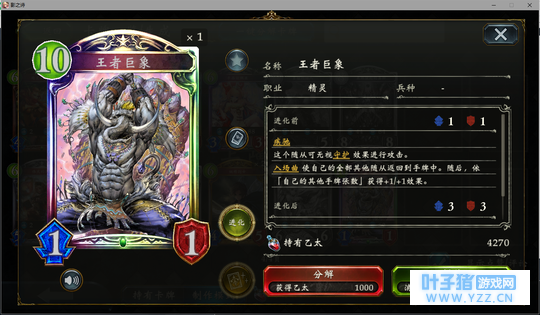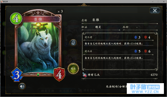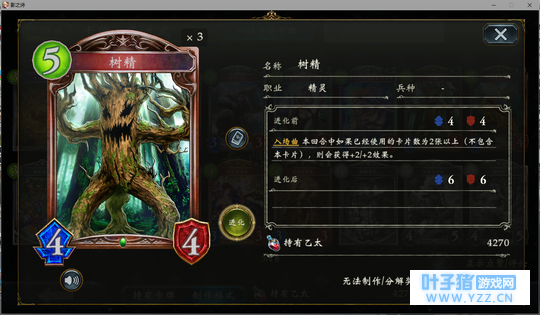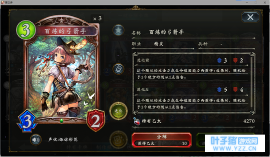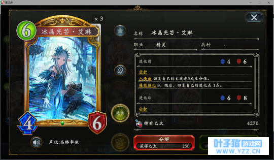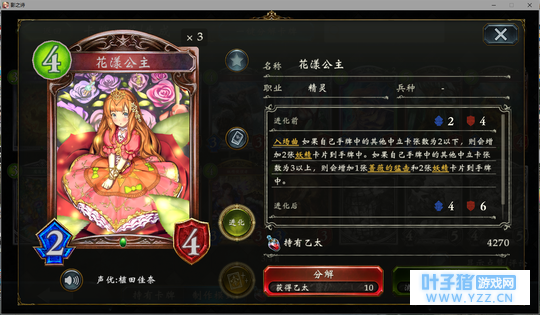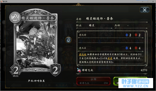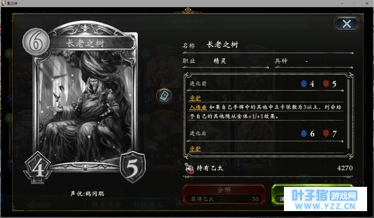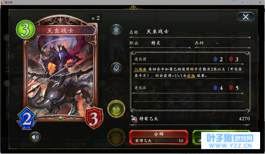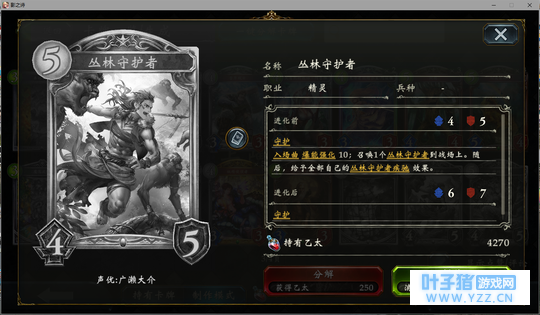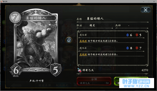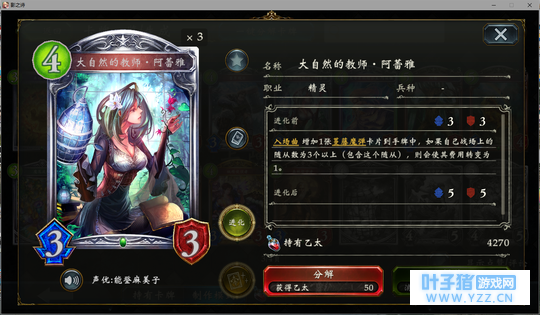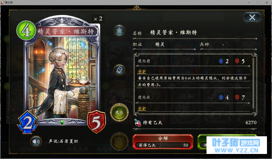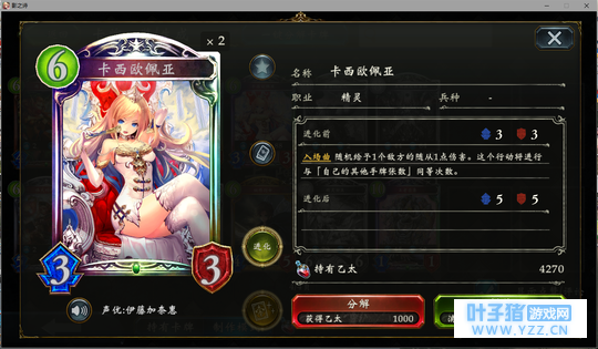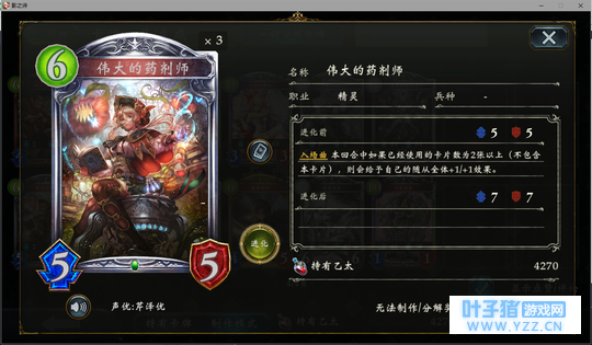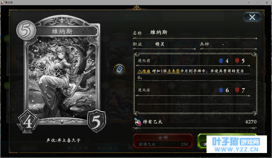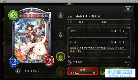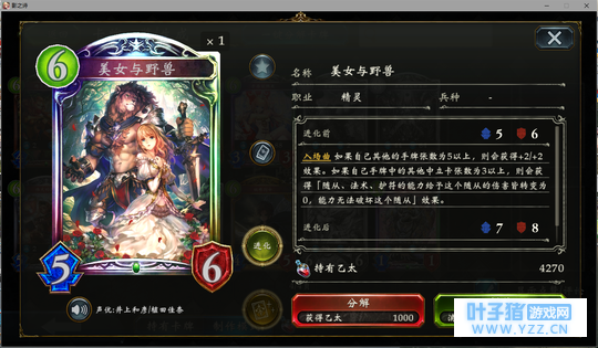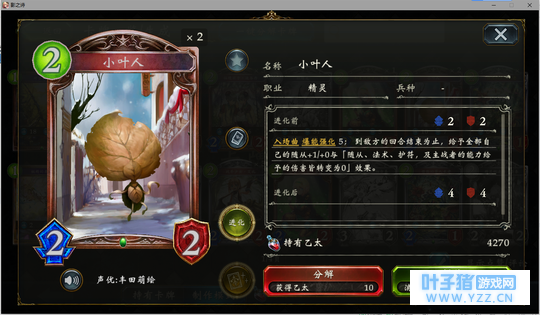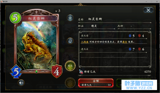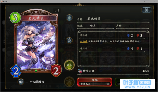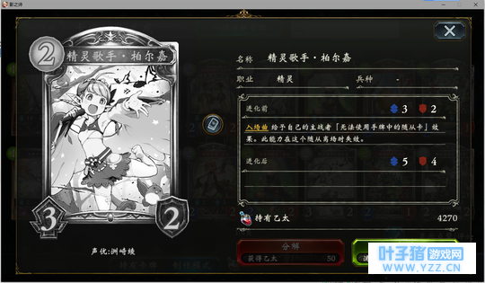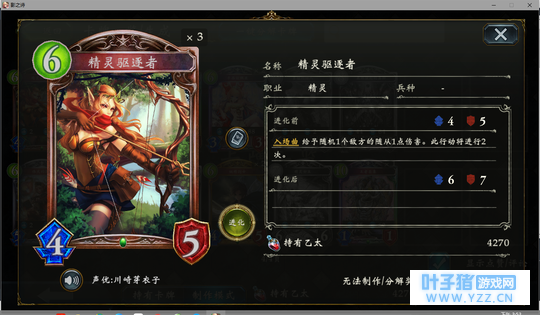 4分 进化回合之前压一个这玩意能让对面难受的要死。同时由于自身4血在很多解牌的射程之外,还能被回收。所以有些时候对面会为了把她解掉浪费一个随从与一个进化点。能有效扩大自身优势。不过由于本身属于金虹抓位,并不是太容易抓的到。