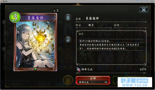 3分 还算可以的解牌,因为这卡本身需要3费才能打出去,而且需要随从作为跳板,所以前期不太能打的出去。大多数时候打3-4。属于能用的牌。在有场面的情况下比上面的魔弹好用一点。