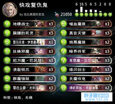 慢速/控制 你要问我这个游戏最稳健的控制卡组是哪一家,我会回答你是无限模式的控鬼。控鬼具备一个控制卡组所需的一切要素:过牌,回复,单解,aoe,终结手段。而且,控鬼是很少的能抓快攻的控制卡组,而且对大多数铺场中速都是优势对局。只是,控鬼难以战胜威胁密度特别高的卡组,如葬送死;并且进攻性差,难以战胜虫妖与超越法。就突出的点来说,控鬼拥有全游戏最优质的aoe之一:启示录,全场打8足以解决你能遇到的大多数场面。回复能力出众,大量的回2回4还有苟活用结界,可以轻松的牵制快攻。总之,控鬼绝对是环境中快攻和铺场卡组流行时,偷环境上分的好选择。