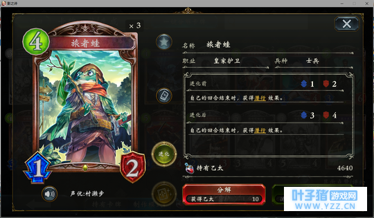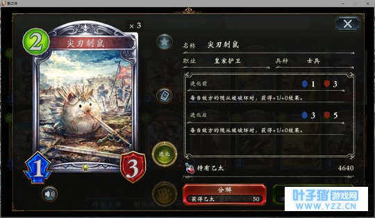 2.5—4分 (蛤皇警告)在正常抓牌的卡组中应该是不怎么会看到这张的。除非你的卡组已经拿了一定数量的buff牌后可以考虑抓取。这张牌能每回合稳定输出伤害,同时进化后4血也不吃大多数的aoe。
