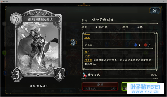 4分 有成长性,自带嘲讽。如果能成长起来能给对面带来不小的麻烦。在卡组有亚瑟的前提下可以抓2-3张,否则建议1-2张。