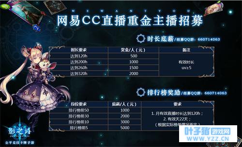 不怕没人气,只怕不坚持 担心直播没人看?害怕直播冷场?对于没经验的新主播来说,该面对的总要面对才会有成长。我们的助力,你不要畏首畏尾! 活动时间内,月直播时长大于150小时且每月直播时长大于22天,200全勤奖励拿直接拿走不废话!而且《影之诗》的主播只要满足有效直播时长要求,持续提供稳定有效直播内容,不看其他直播数据,时长越长奖金越多! 半夜睡不着晚上特精神的你非常适合挑战这项全勤奖金:只要通宵(2点-次日10点)、月直播时长大于150小时,且每月直播时长大于22天,更有300通宵奖励拿! 你是游戏高手?你一不要错过这排行榜项底薪挑战。游戏段位排行榜越高,排行奖励也越丰富,简直就是高玩的优势项目。 直播与爬段两不误,两面都能赚真金!