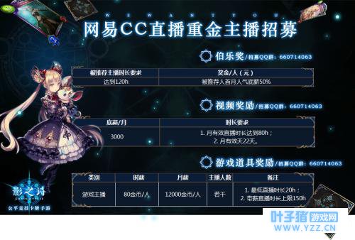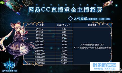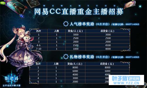 《影之诗》是一款由Cygames开发、网易运营的一款集换式卡牌竞技对战手游。精心设计的7大主战职业,由日本知名插画师联合打造的上千枚精致卡牌牌面原画,丰富多彩且富有智慧的卡牌策略组合,加上创新卡牌进化系统与人气声优助力,网易携手Cygames为玩家创造一个公平精彩的集换式卡牌竞技环境。 网易CC直播《影之诗》主播招募活动现已开启,多种奖励机制总有一个适合你,加入QQ群获取更多信息:660714063。 丰厚奖金,官方签约机会,海量奖励等你来拿!