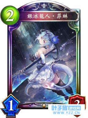 银冰龙人‧菲琳 CV:雨宫天 职业:龙族 稀有度:传说 消耗:2费 身材:1/3→2/4入场曲:增加1张银冰吐息卡片到手牌中。 进化时:给予1个敌方的从者1点伤害。