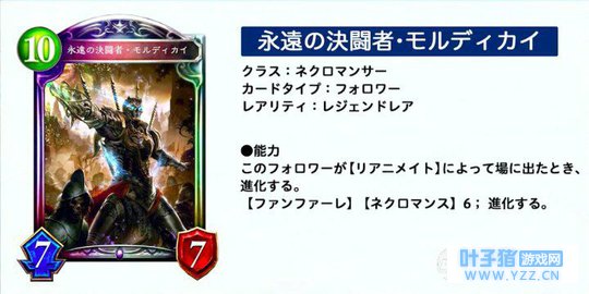 稀有度:传说 类别:随从 消耗:10 身材:7/7→7/7 当这个随从因为 亡者召还 的效果出场时,获得进化。